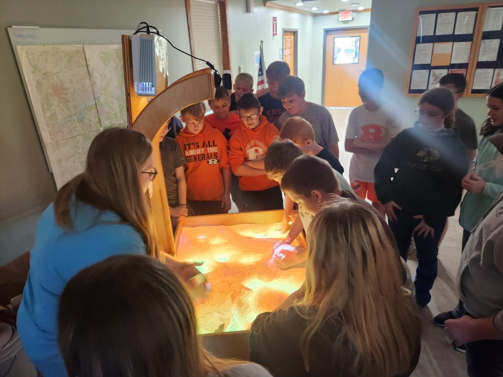 The Watershed Sandbox Lesson Plan is available for classrooms grades 4-12.  It is an interactive, hands-on educational tool that demonstrates how water moves across land within a watershed. By simulating rainfall over a 3D landscape, participants can see how water flows downhill, forms streams and rivers, and eventually drains into larger bodies of water. The model also helps illustrate how everyday activities and land use—such as farming, construction, and urban development—can impact water quality through runoff and pollution movement.  This visual demonstration makes complex water concepts easy to understand, helping users see how watersheds function in real time. It is commonly used in environmental education programs, classroom lessons, workshops, and community outreach events.  Best suited for upper elementary through adult audiences.