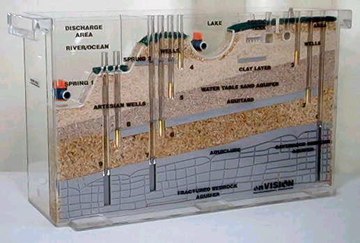 The groundwater model is available for classroom demonstrations for grades 4-12. The model is designed to help teach principles of groundwater movement and contamination. The model is a cross-section of a soil profile, highlighting the different textures (sand, silt, clay and rock) which make up our soils. Dye is added to the model to demonstrate various types of groundwater pollution. Students can see how pollution can enter into the groundwater supply and how it travels.
